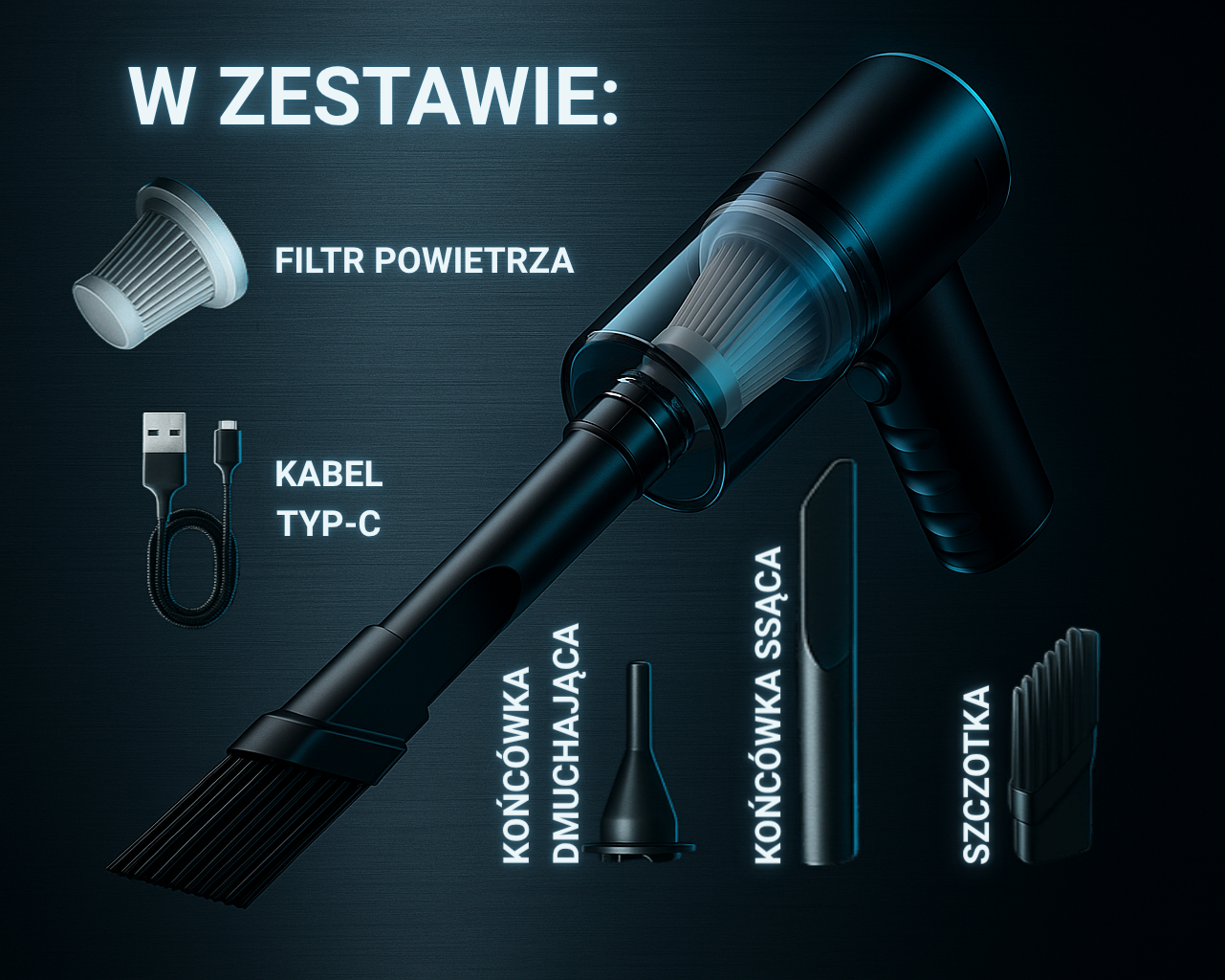 Tak — odkurzacz posiada filtr (np. HEPA) oraz kilka wymiennych końcówek do różnych zastosowań.