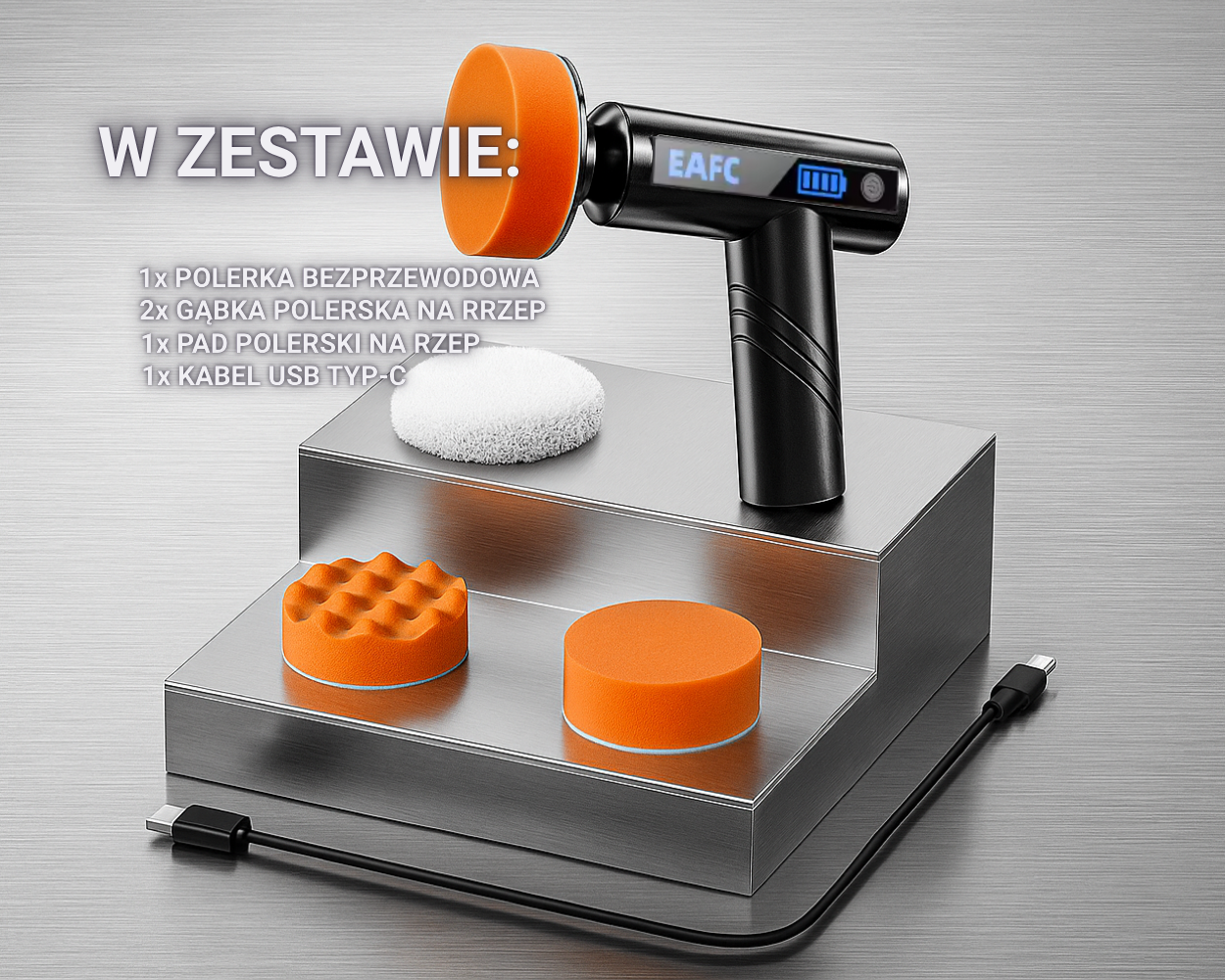 Tak, zestaw zawiera trzy różne rodzaje padów polerskich, kabel ładujący oraz samo urządzenie — gotowe do pracy zaraz po rozpakowaniu.